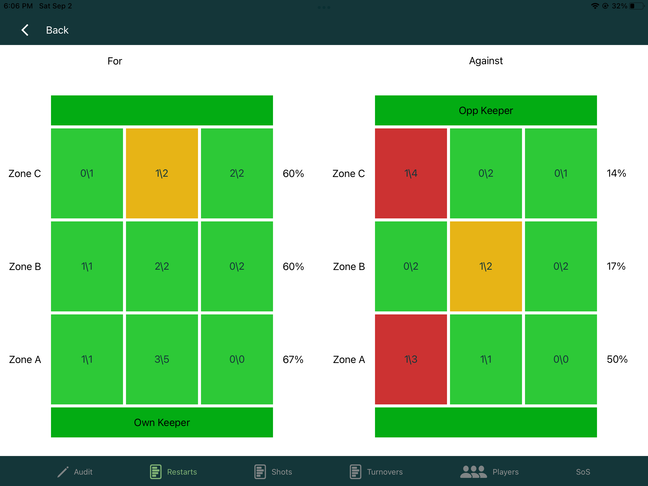 This screen provides a unique, insightful calculation that helps you understand where your team's shots and scores are originating—either from restarts or turnovers, and in which areas of the pitch.
